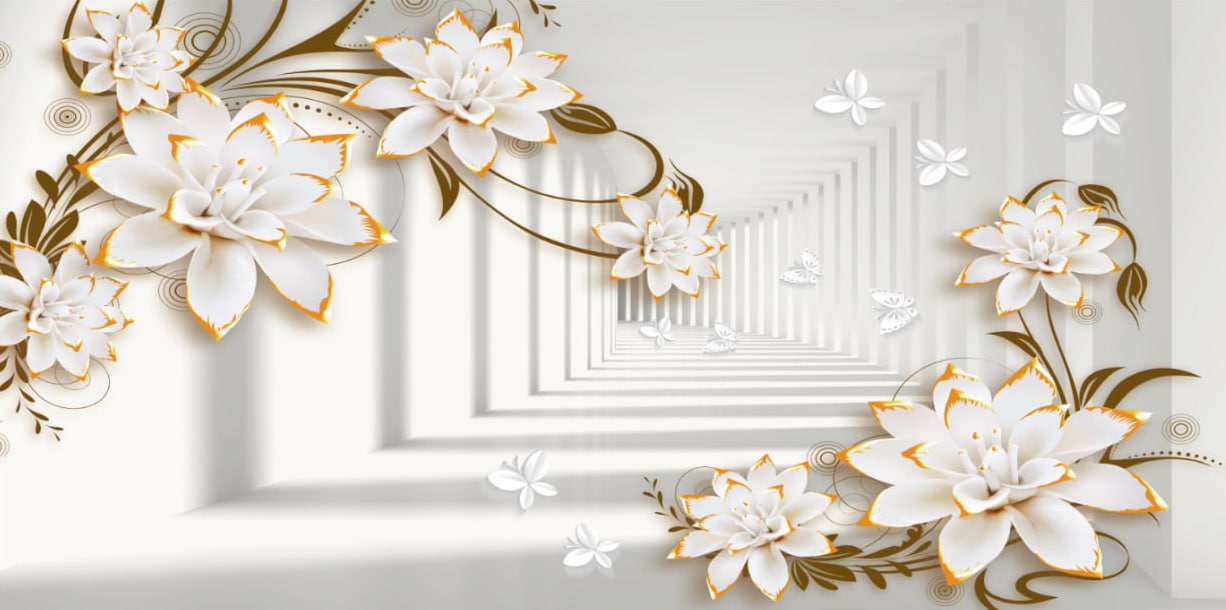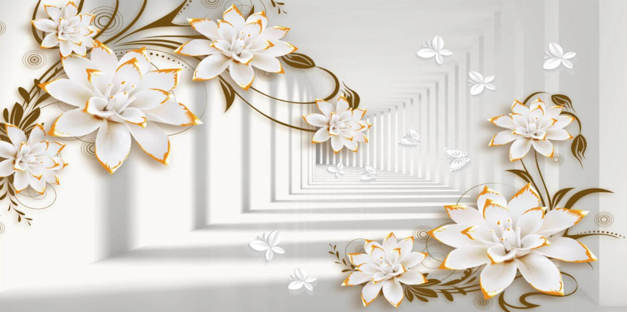 پوستردیواری سه بعدی گل و پروانه با ترکیبی از رنگ های سفید،طلایی و راهرویی بی انتها،به سبک سه بعدی طراحی شده است