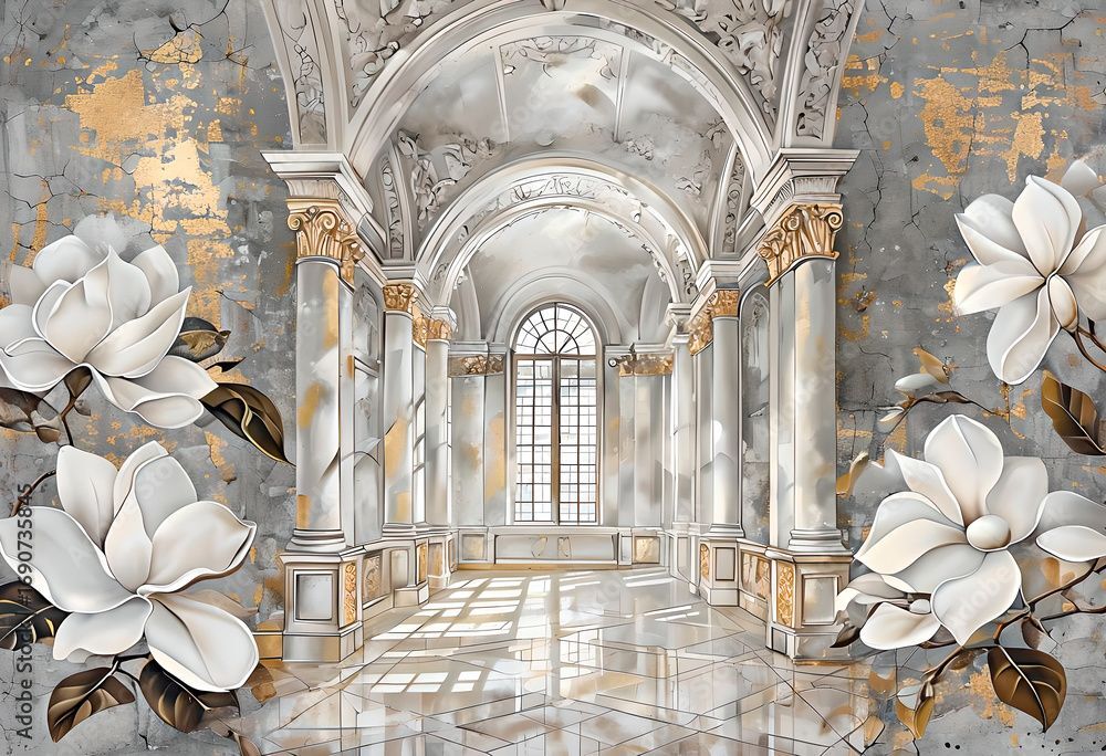 در دو طرف تصویر، گلهای سفید بزرگ با بافت سهبعدی و برگهای طلایی قرار گرفتهاند که علاوه بر ایجاد هماهنگی رنگی، حس لطافت و آرامش را در برابر معماری قدرتمند وسط تصویر متعادل میکنند. این ترکیب هنرمندانه باعث شده طرح، هم برای دکوراسیون مدرن مناسب باشد و هم برای دکوراسیون کلاسیک و لاکچری.