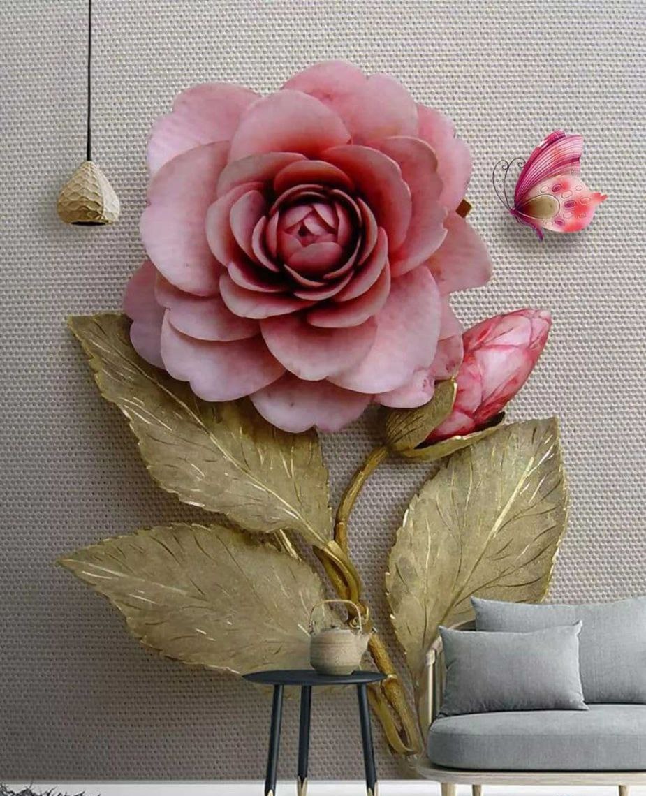پستر دیواری یکی از عناصر مهم در طراحی و دکوراسیون داخلی است که میتواند به راحتی فضای خانه یا محل کار را دگرگون کرده و جلوهای متفاوت ایجاد کند. در این تصویر، پستر دیواری با طرح یک گل بزرگ و برجسته، جلوهای لوکس، طبیعی و چشمنواز به محیط بخشیده است. گل اصلی که در مرکز تصویر دیده میشود، با رنگهای ملایم صورتی و بافت بسیار طبیعی طراحی شده است و میتواند حس آرامش، لطافت و زیبایی را به فضا منتقل کند. برگهای طلایی که در اطراف گل قرار دارند، باعث ایجاد تضاد رنگی چشمگیر و جذاب شدهاند و حس اشرافیت و لوکس بودن را افزایش میدهند.