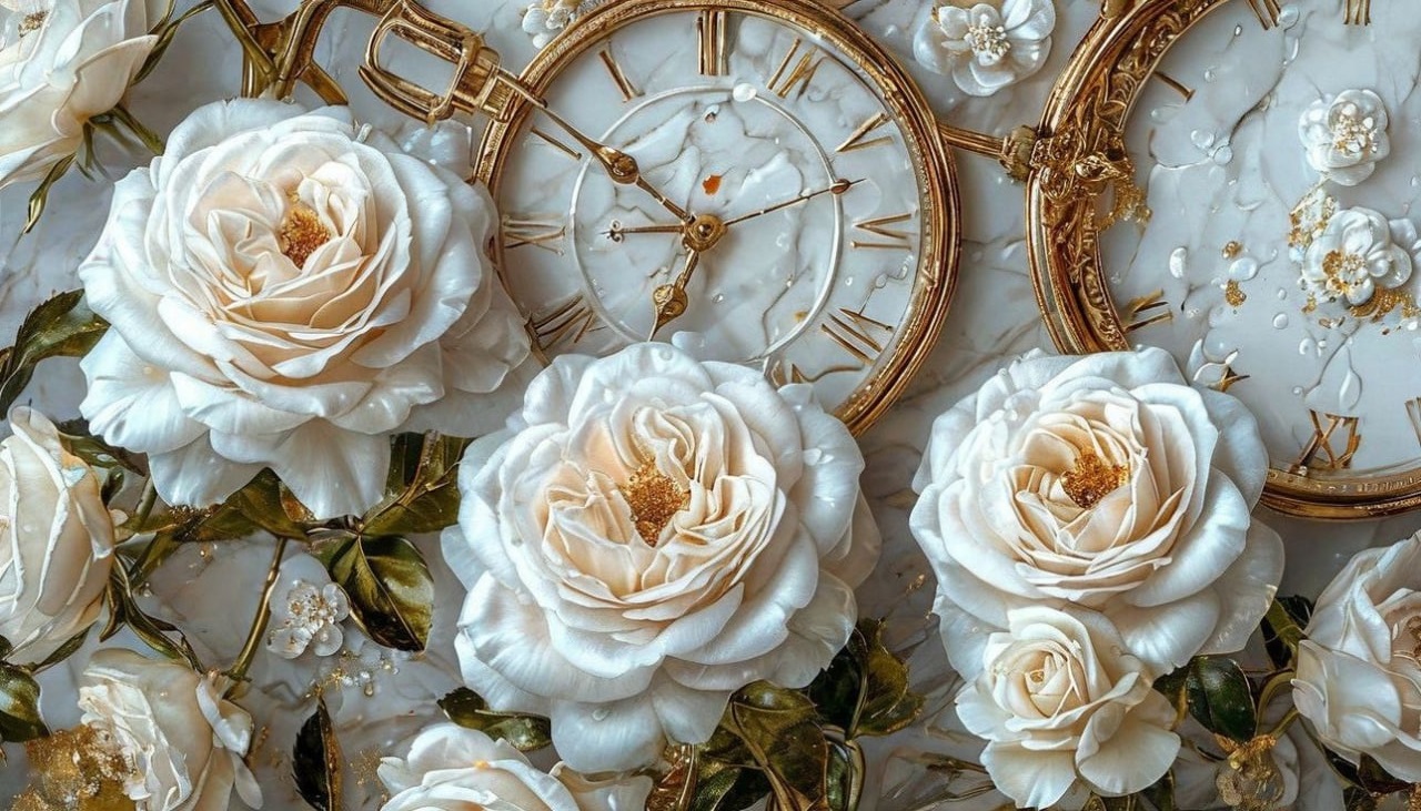 پوستر دیواری لوکس طرح گل رز سفید و ساعت طلایی