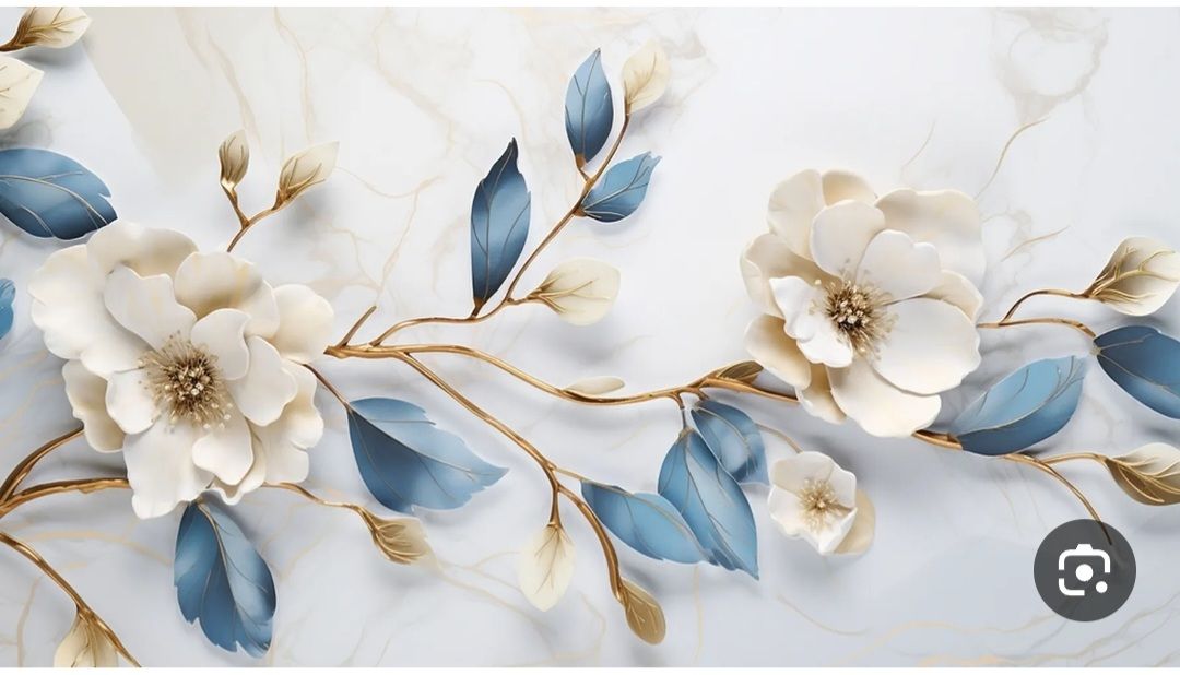 در این پوستر دیواری والیو، گلهای بزرگ سفید مخملی با لبههای آبی فیروزهای و شاخههای طلایی ۲۴ عیار به شکلی کاملاً سهبعدی و برجسته طراحی شدهاند که انگار از دیوار بیرون زدهاند. زمینه مرمر سفید با رگههای طلایی باعث میشه این پوستر دیواری والیو در هر نوری مثل جواهر بدرخشه.
