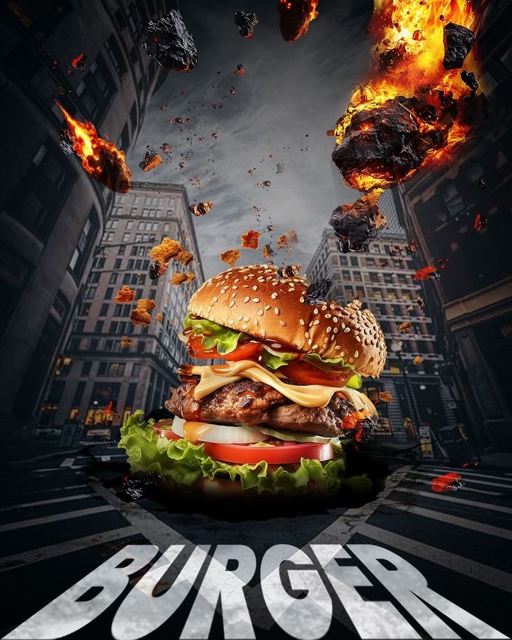 جزئیات تصویر به قدری واقعی و شارپ است که مشتریهای فستفود شما فکر میکنند واقعاً یک برگر غولپیکر از آسمان فرود آمده! نان کنجدی برشته، پنیر آبشده، گوشت گریلشده، کاهو تازه و گوجه قرمز، همه با افکت سهبعدی و نورپردازی سینمایی طراحی شدهاند.