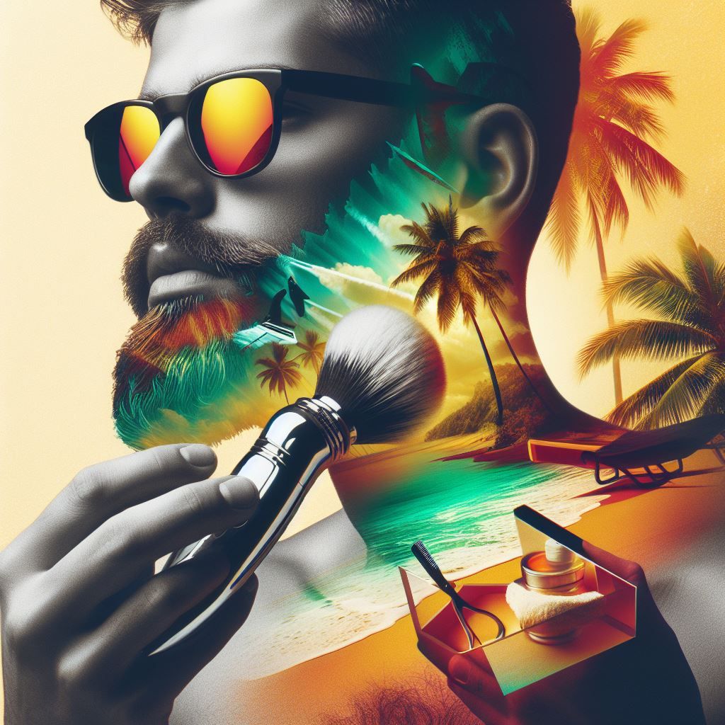 پوستر دیواری باربرشاپ ساحلی با مرد عینک آفتابی و قلم اصلاح