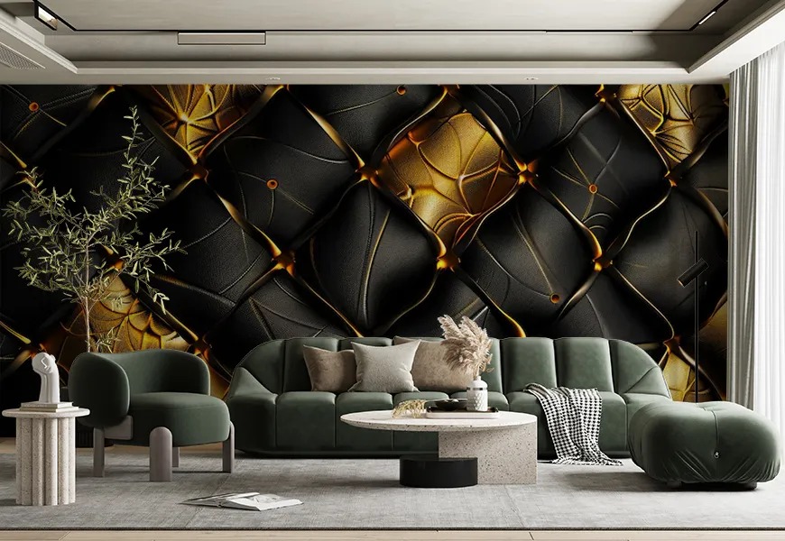 پوستردیواری لاکچری سه بعدی مشکی و طلایی با طرح و ترکیب رنگ دارک و لوکس مناسب سلیقه نسل جدید و استفاد به کافه ها و رستورانهای شیک و لاکچری