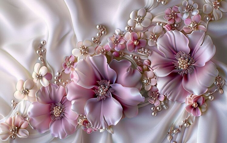 پوستر دیواری گلهای صورتی لوکس با مروارید و بافت ابریشمی | دکوراسیون شیک منزل - وال یو ۱۹۰,۰۰۰ تومان